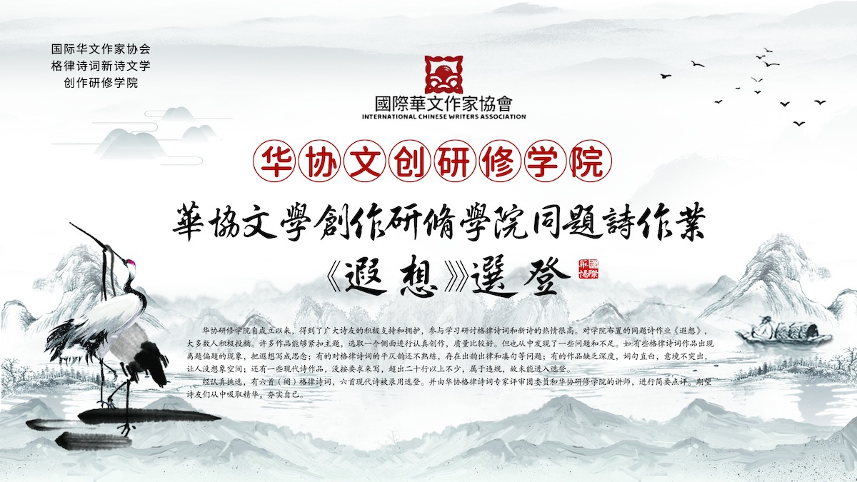 经认真挑选,有六首(阕)格律诗词,六首现代诗被录用选登。并由华协格律诗词专家评审团委员和华协研修学院的讲师,进行简要点评。期望诗友们从中吸取精华,夯实自已。